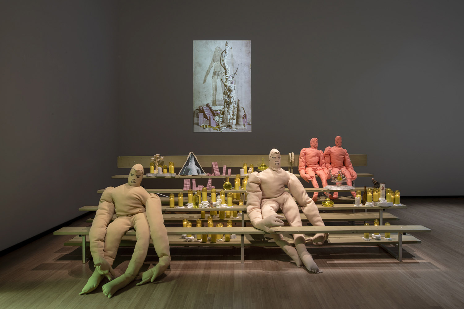 Conceived as a new phase of creation, the exhibition gathers and redistributes the elements of a work in search of new languages, forms, and visions in a devastated world. In the absence of performers, it is the materials themselves that come alive and perform within an installation that evokes, all at once, a theater, a gymnasium, a forest, a cathedral, Noah’s Ark and, of course, an island.